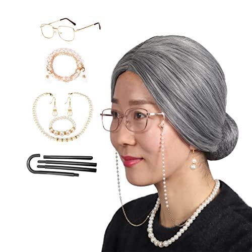 HOWAF Old Lady Costume Set Grey Wig Grandma Wig Wig Cap Granny Glasses with Chain Artificial Pearl Necklace Earrings Bracelet Old Lady Fancy Very well made.