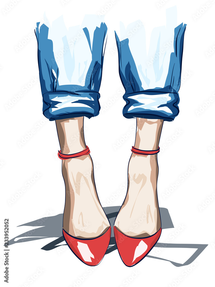 Fashion sketch print. Legs in red shoes with high heels. Vector Very well made.