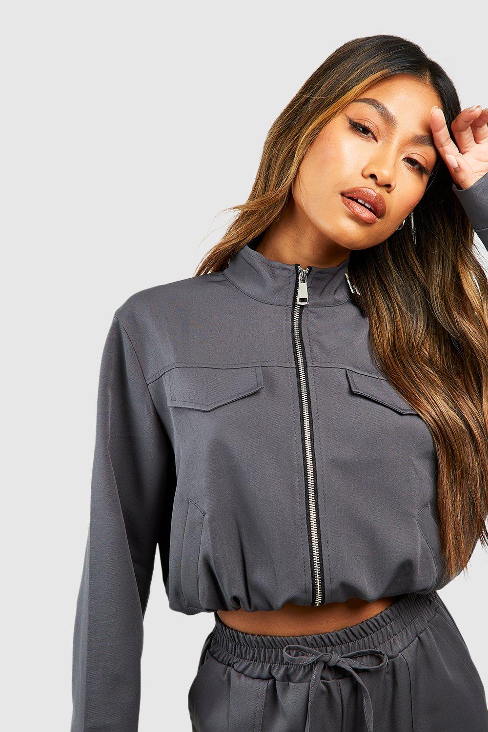 Flying Fantasy Charcoal Grey Nylon Cropped Bomber Jacket Pink Very well made.